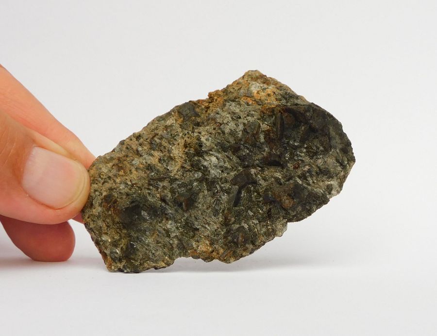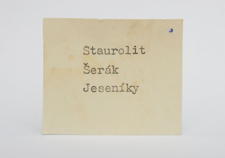 Plochý vzorek svoru o velikosti 7,4x5x1,5cm s hojnými, hranolovitě sloupcovitými, průsvitnými krystaly staurolitu tmavě hnědé barvy, pocházející z vrcholu Šerák. Nález z 80. let. Ex.Coll. MUDr. J. Smolka, Hradec Králové. Novinky - červen 2024.
