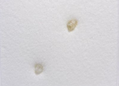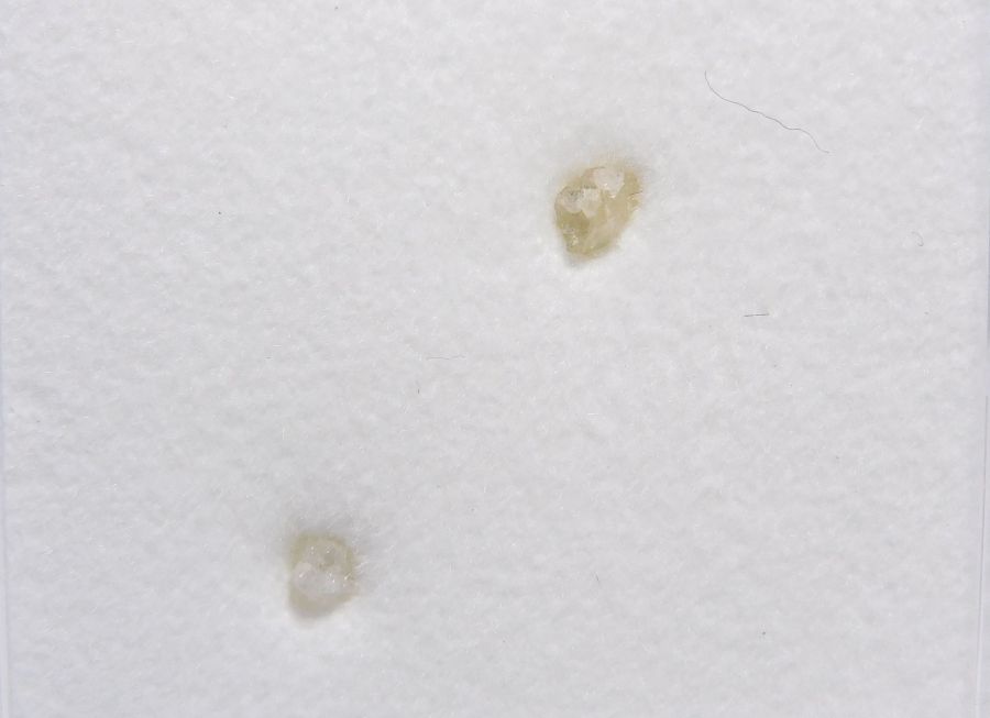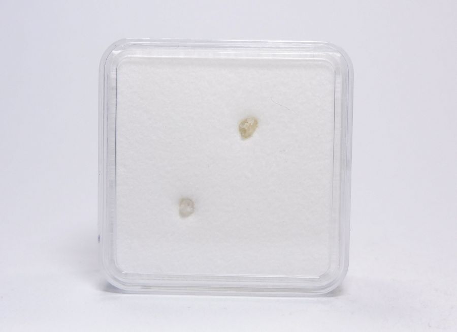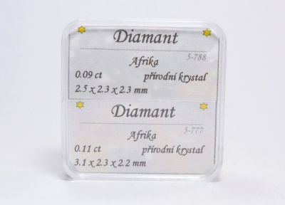 Plastová krabička se dvěma lesklými a hojnoploše vyvinutými krystaly diamantů, a to v bělavé a v druhém případě lehce nažloutlé barvě. Velikost 2,5mm a 3,1mm. Velikost krabičky 38x38mm.