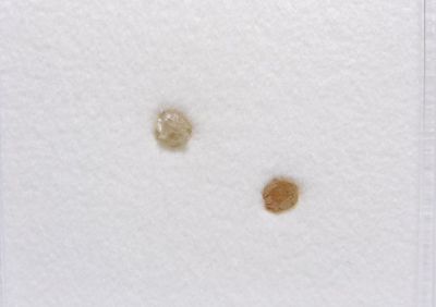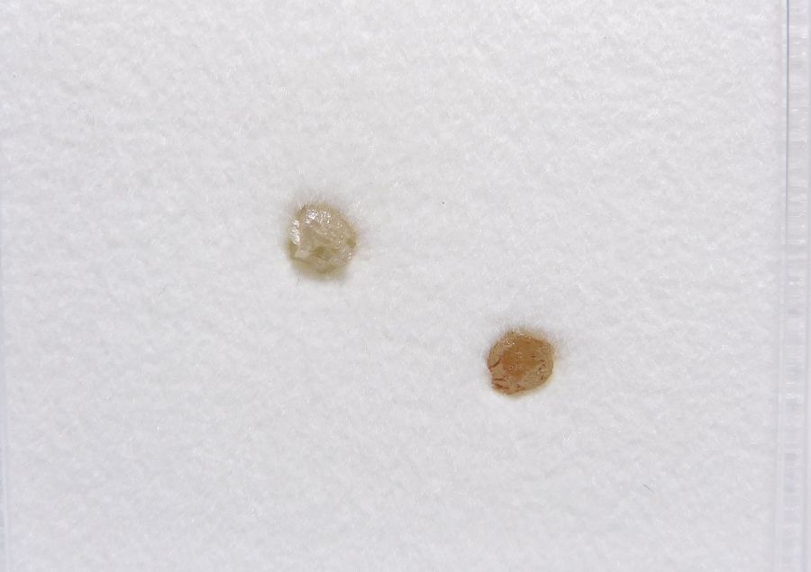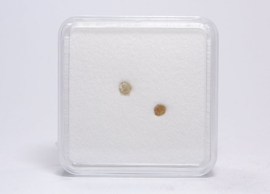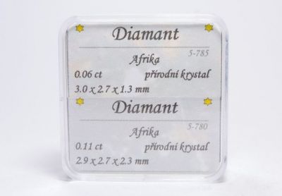 Plastová krabička se dvěma lesklými a hojnoploše vyvinutými krystaly diamantů, a to v bělavé a v druhém případě lehce nažloutlé barvě. Velikost 2,9mm a 3,0mm. Velikost krabičky 38x38mm.