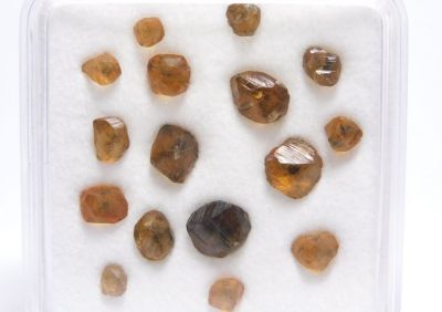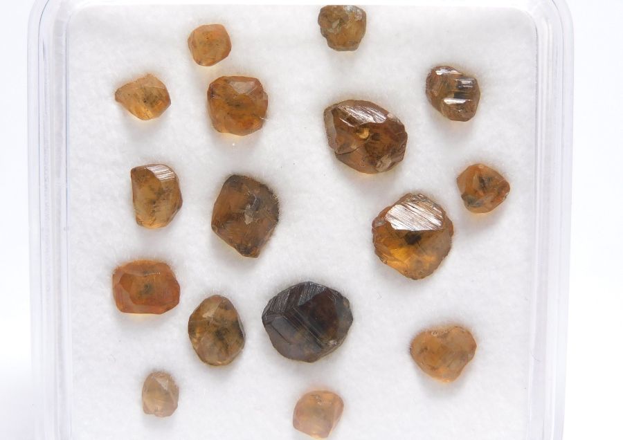 Plastová krabička o velikosti 38x38mm se 16 průsvitnými až průhlednými, skelně lesklými krystaly granátu - spessartinu hnědooranžové barvy o rozměrech 3-6mm.