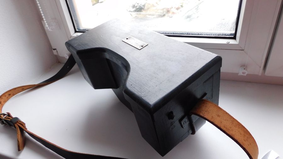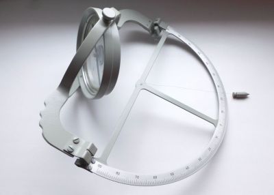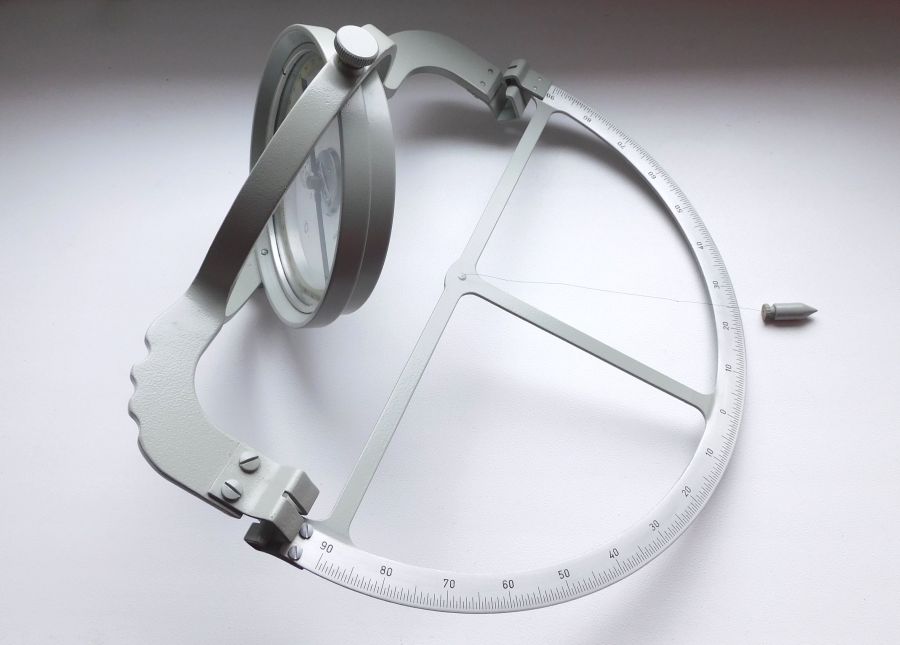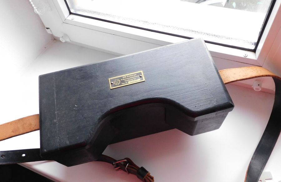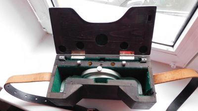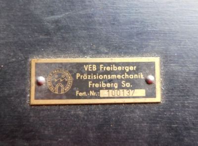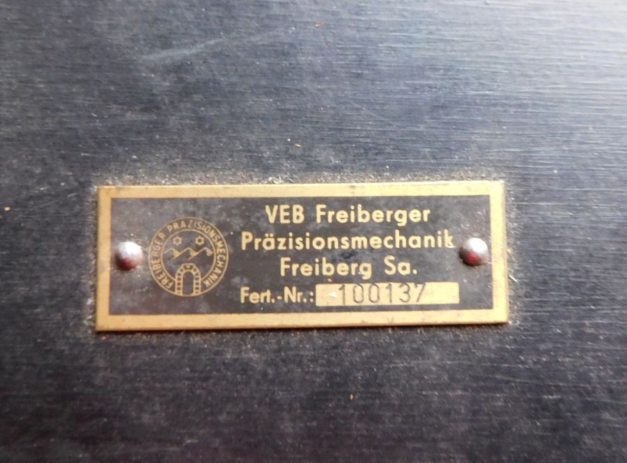 Zcela nepoškozený (nepoužívaný) kompas pro práci důlních měřičů a geologů, který je uložen v dřevěné uzavíratelném pouzdře s koženým řemenem k nošení na rameni. Tento geodetický kompas je vybaven magnetickou jehlou s ostrými hranami na obou koncích, což zajišťuje bezpečné a přesné odečty. Na jižní polovině jehly je upevněno posuvné měděné závaží, které eliminuje jakýkoli sklon. Otočný čep, na kterém jehla kmitá, je pečlivě vycentrován a vyleštěn, což umožňuje prakticky bez tření. Pokud se magnetická jehla nepoužívá nebo během přepravy, je zajištěna na místě otáčením vroubkovaného knoflíku. Závěsný systém obsahuje kružidlo. Dva protilehlé ložiskové šrouby jej volně pohybují uvnitř kroužku závěsného systému. Systém je stejně jako kružidlo vyroben z nemagnetického, korozivzdorného lehkého kovu. Kroužek závěsného systému, který se rozprostírá ve směru sever-jih, nese dva držáky s hranolovitými háky. Spojující čára tyto háky prochází přesně středem kružidla. Úhloměr má tvar půlkruhu. Dělení se rozprostírá od středu ven na obě strany. V otvoru uprostřed půlkruhu visí kyvadlo. Udává příslušný úhel sklonu na dílku půlkruhu. Úhloměr se zavěsí na provázku pomocí dvou háčků, které se otevírají do strany. Závěsný kompas: Průměr stupnice 80 mm; dělení stupnice 2° (2 grády); odhad odečtení 0,2° (0,2 grádu); rozteč závěsných háků 236 mm; ustálení magnetické střelky ≤ 70 sec; rozptyl přesnosti magnetické střelky ± 0,2° (0,2 grádu). Závěsný sklonoměr: poloměr sklonoměru 118 mm; dělení stupnice 0,5 ° (0,5 grádu); Přesnost odhadu na stupnici 0,1° (0,1 grádu). Velikost dřevěného pouzdra (bedýnky): délka 27cm, výška: 16,5cm; šířka 13cm. Výrobce: VEB Freiberger Präzisionsmechanik Freiberg Sa. Vyrobeno v 70. až 80. letech.