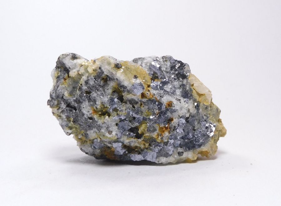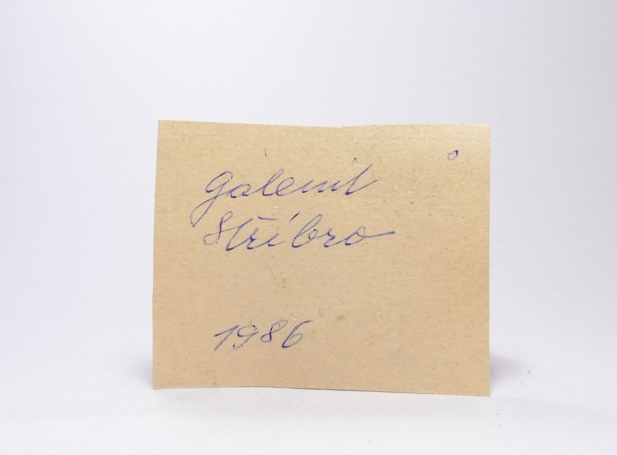 Rudní ukázka tvořená kovově lesklými, štěpnými agregáty olověně šedého galenitu, který se zrny hnědého sfaleritu zarůstá do křemenné žiloviny 5,5x3,7cm. Z roku 1986. Ex.Coll. MUDr. J.Smolka, Hr.Králové.