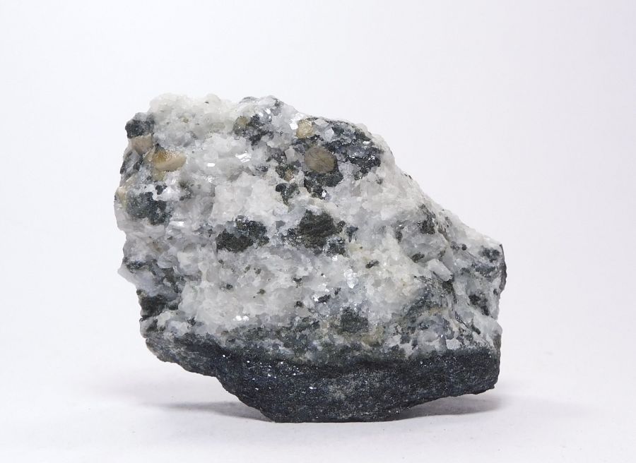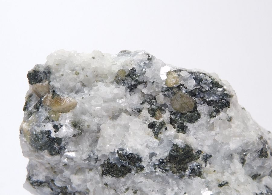 Vzorek 5,5x3,7cm s lesklými a průsvitnými xx titanitu žlutohnědé barvy mezi zrny kalcitu, křemene a kumulacemi chloritu. Ex.Coll. MUDr. J.Smolka, Hr.Králové.