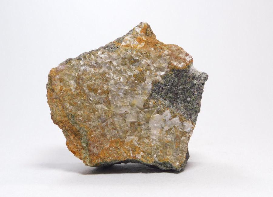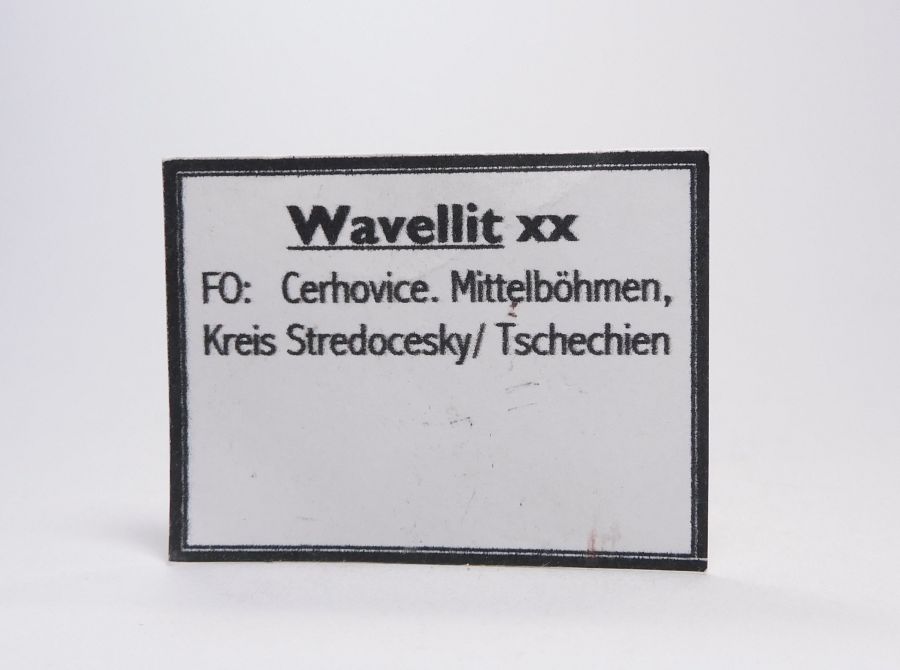 Vzorek droby o velikosti 4,9x4,6cm se souvislou drúzou hedvábně lesklých a radiálně uspořádaných jehlic. krystalů bezbarvého wavellitu. Ex.Coll. S. Meier, Gera, Německo.