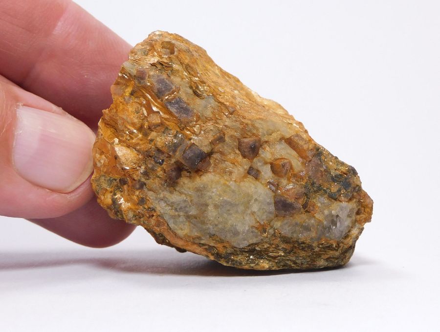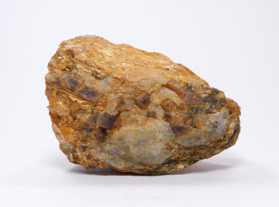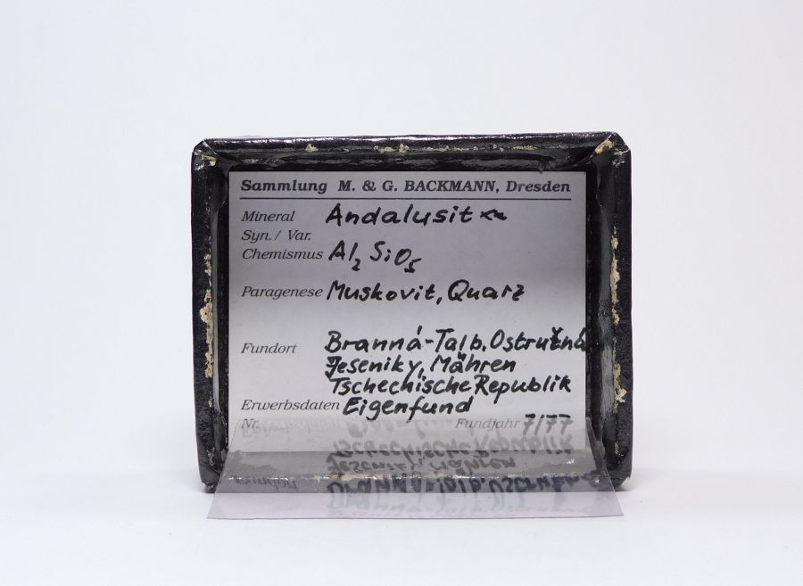 Vzorek pegmatitu o velikosti 5,2x4,4x3,6cm s křemenem, do kterého zarůstají průsvitné a fialově zabarvené, hranolovitě sloupcovité xx andalusitu. Nález z roku 1997. Vzorek se sbírkovou popiskou a krabičkou. Ex.Coll. G. Backmann, Drážďany, Německo.