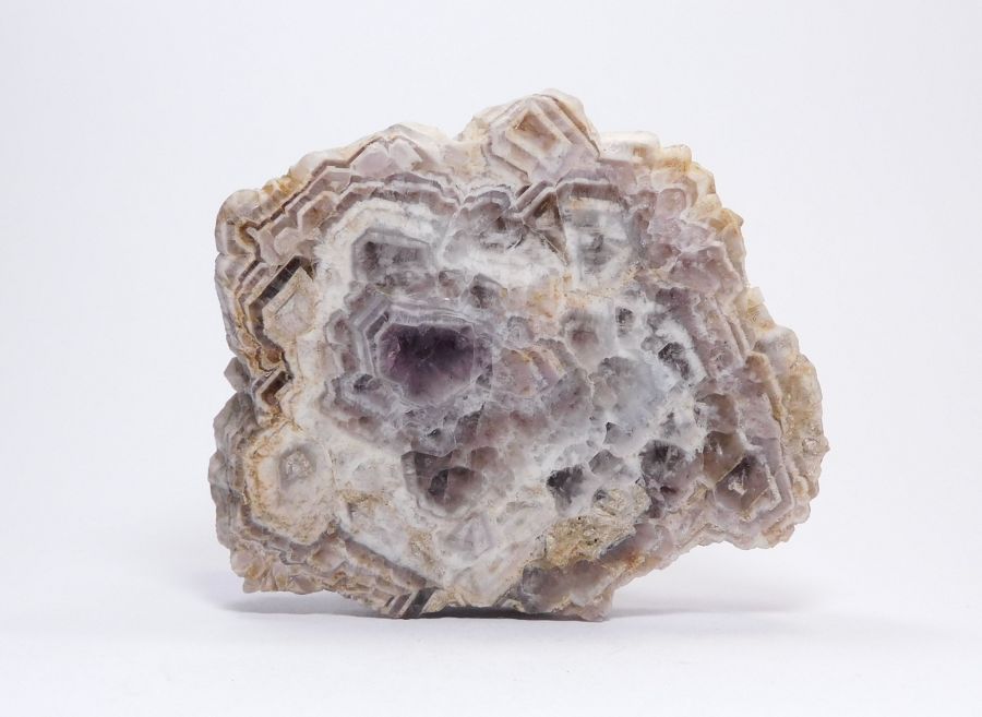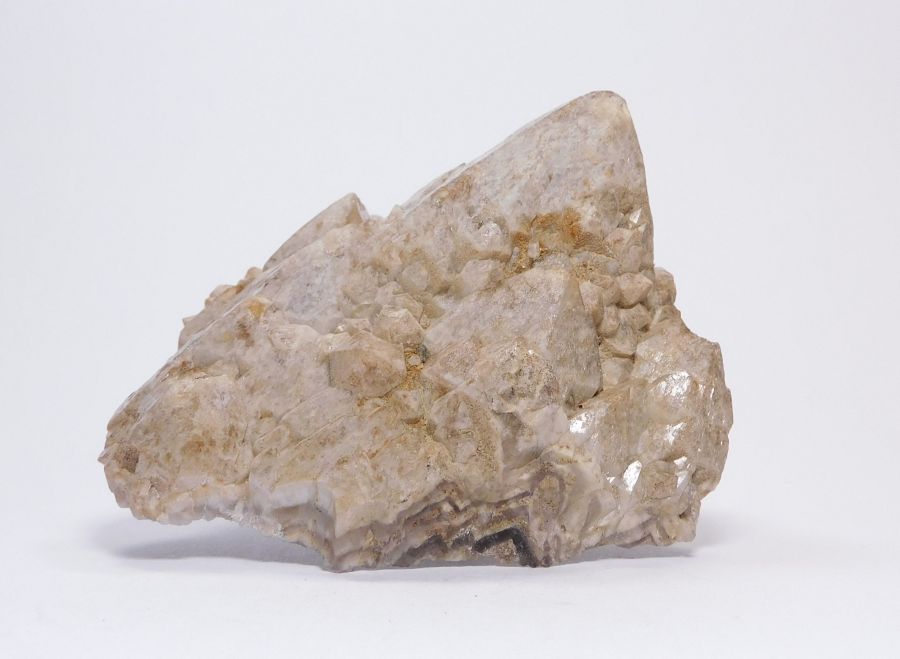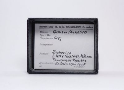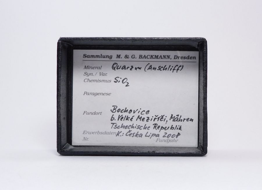 Estetická drúza skelně lesklých a povrchově bíle zbarvených krystalů křemene o celkové velikosti 7,4x6,1x3,9cm, mající zonální vývoj, o čemž svědčí ve spodní části seříznutá a následně vyleštěná plocha s krásnou texturou. Zde je možné spatřit hned několik odrůd křemene, a to světle hnědé záhnědy, světle fialového ametystu, bezbarvého křišťálu a mléčně zabarveného křemene. Jedná se o můj vlastní nález v roce 1991. Úsměvné, když se „kluci“ vrací po desetiletích domů 😊. Vzorek se sbírkovou popiskou a krabičkou. Ex.Coll. G. Backmann, Drážďany, Německo.