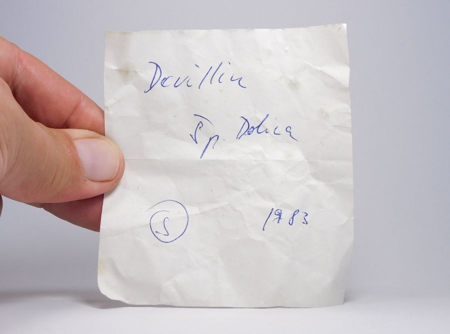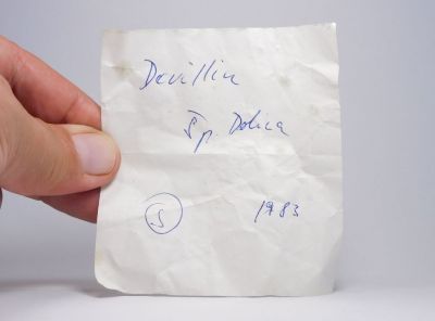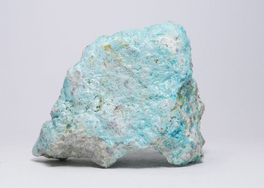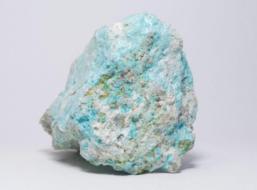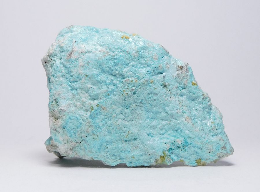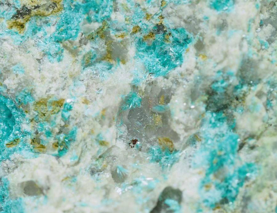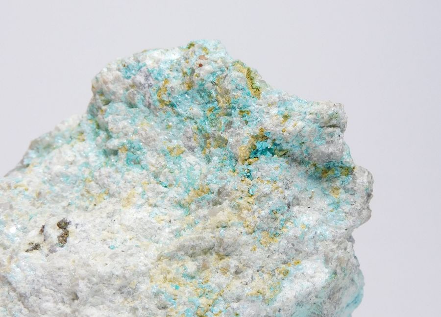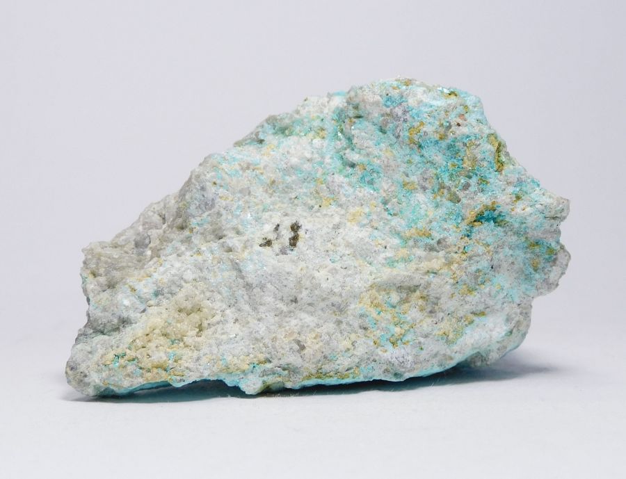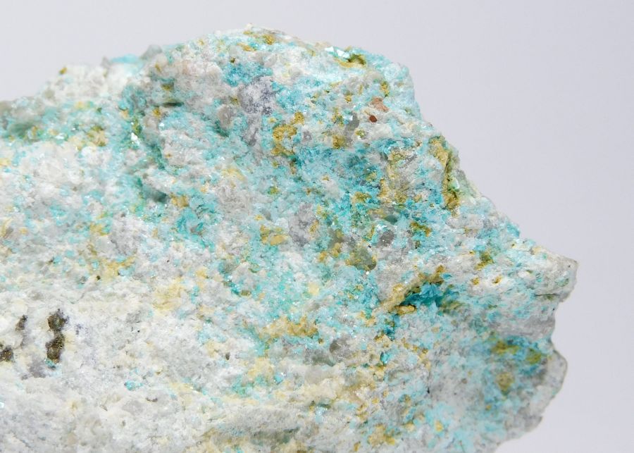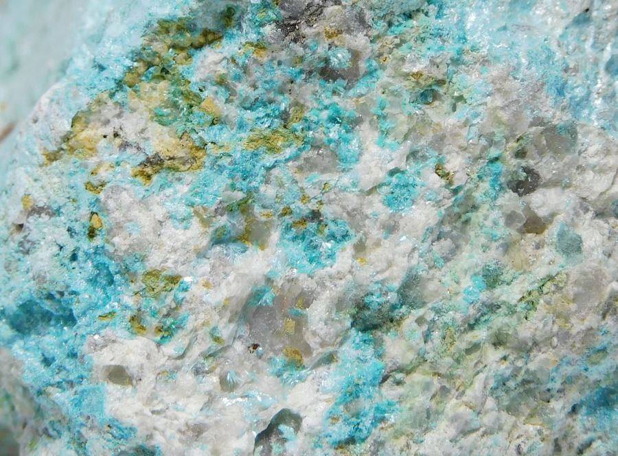 Poměrně bohatý vzorek pískovce o velikosti 7,2x4,9x2,3cm s hojnými perleťově lesklými a pomněnkově modrými tence tabulk. xx posnjakitu, které doprovází kůry a drobné světlé modrozelené xx langitu a především v dutinkách tyrkysově modrozelené jehlicovité xx devillinu.