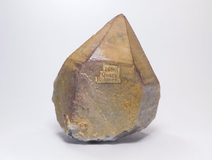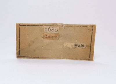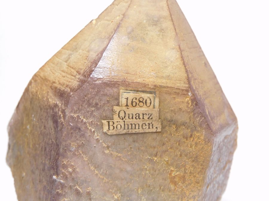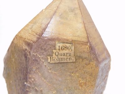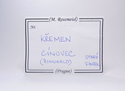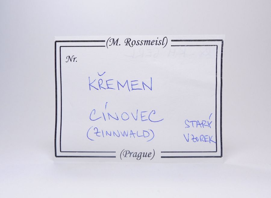 Historická ukázka křemene pocházející z cínoveckého greisenového ložiska W-Sn rud. Krystal křemene je o velikosti 7,2x6,4x5,5cm. Vzorek původně pochází ze staré sbírky viz sbírková popiska. Posléze se objevil ve sbírce Karlheinze Gerla, Německo. Ze sbírky MUDr. T. Rossmeisla. Praha.
