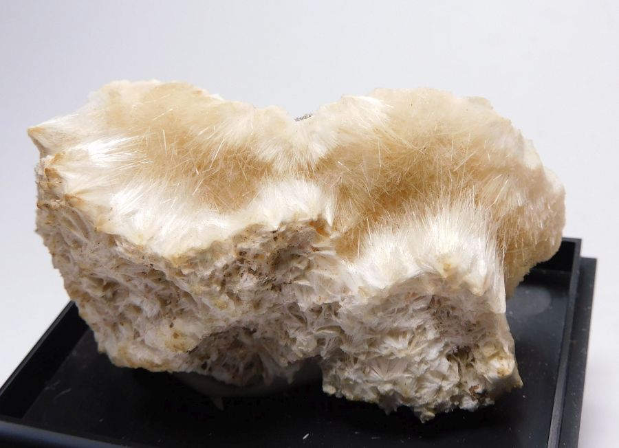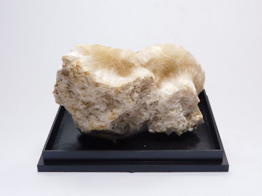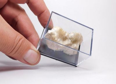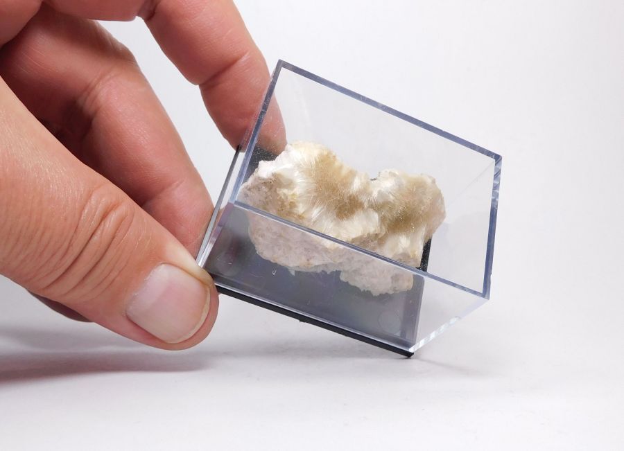 Pěkná ukázka natrolitu, což je hydratovaný hlinitokřemičitan sodný ze skupiny zeolitů, který tvoří výplň „volné“ dutiny z alterovaného bazanitu skelně lesklými, bezbarvými, jehlicovitými krystaly. Velikost 5,1x2x3cm. V plastové krabičce. Ex.Coll. S. Meier, Gera, Německo.