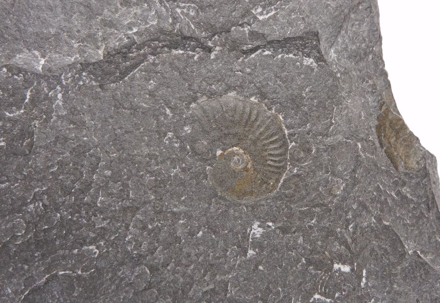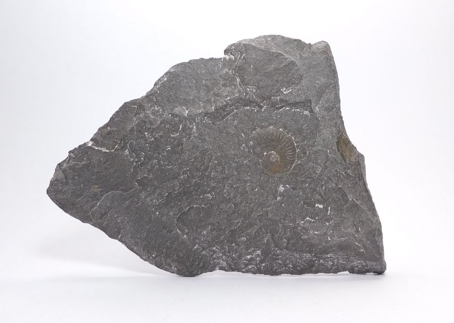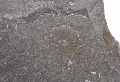Plochý vzorek šedočerné břidlice o velikosti 12x8,5x0,8cm se zachovalou schránkou amonita 1,8cm bez bližšího určení. Stáří - spodní jura (183-180 mil.let).