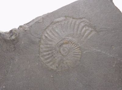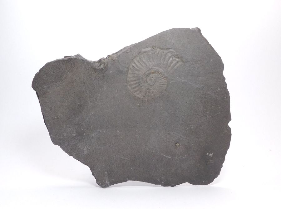 Plochý vzorek šedočerné břidlice o velikosti 12,8x10,7x1,3cm se zachovalou schránkou amonita bez bližšího určení o průměru 4,2cm. Stáří - spodní jura (183-180 mil.let).