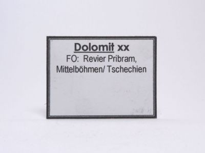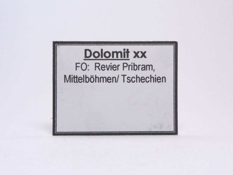 Velmi pěkná a především zcela nepoškozená ukázka uhličitanu vápenato-hořečnatého - dolomitu, pocházející z příbramského polymetalického revíru. Zmíněný dolomit vytváří souvislou a miskovitě prohnutou drúzu lesklých, průsvitných a bělavě zabarvených krystalů klencového tvaru o celkové velikosti 11,2x9,3x1,4cm. Ze starší německé sbírky. Ex.Coll. S. Meier, Gera, Německo.