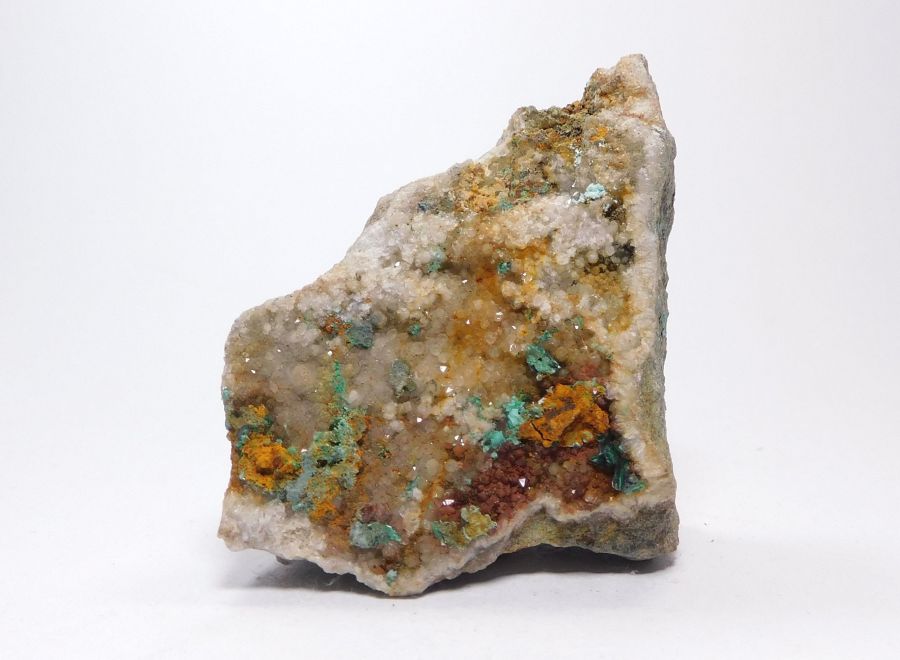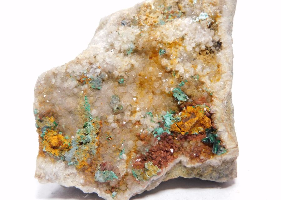 Vzorek 5,1x4xm se souvislou drúzou xx křemene, na které nasedají drobně jehlicovité až vláknité agregáty zeleného malachitu.