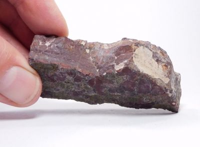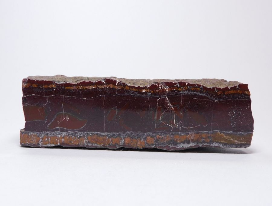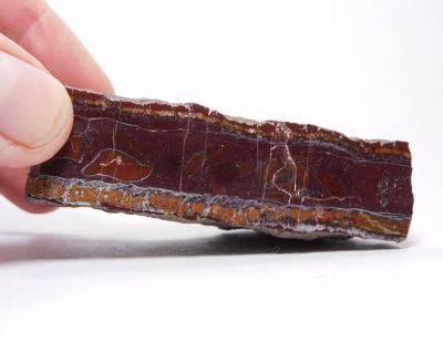 Leštěný vzorek žilného jaspisu hnědočervené barvy o velikosti 7,6x2,3cm s uzavřeninami cihlově červené barvy.
