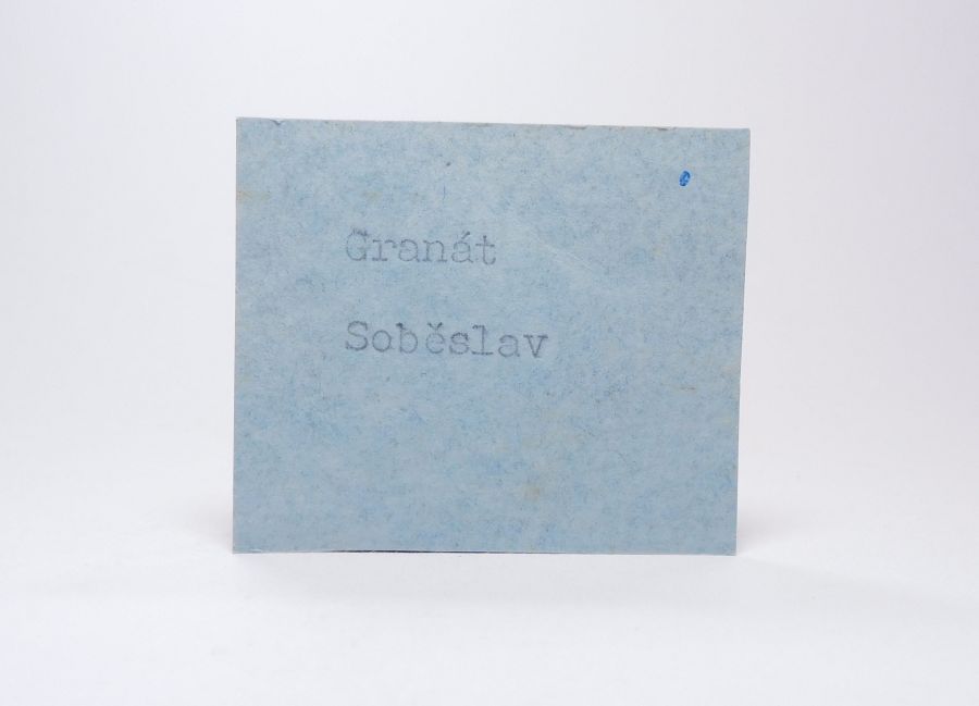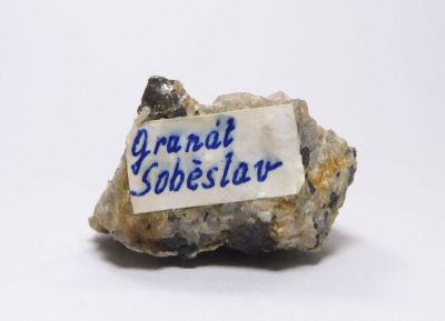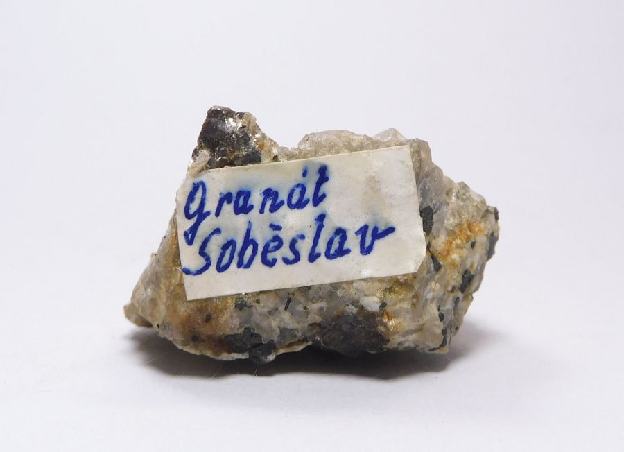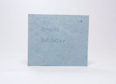 Vzorek pegmatitu 4x3,4cm se zarůstajícími xx granátu - almandinu temně červené barvy. Z 80. let. Ex.Coll. MUDr. J.Smolka, Hr.Králové.