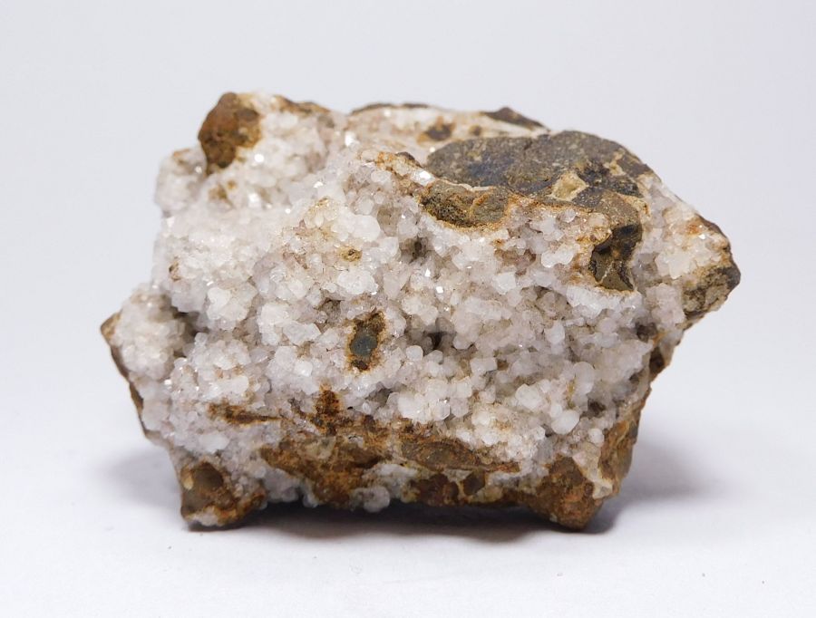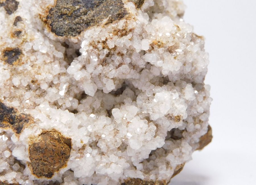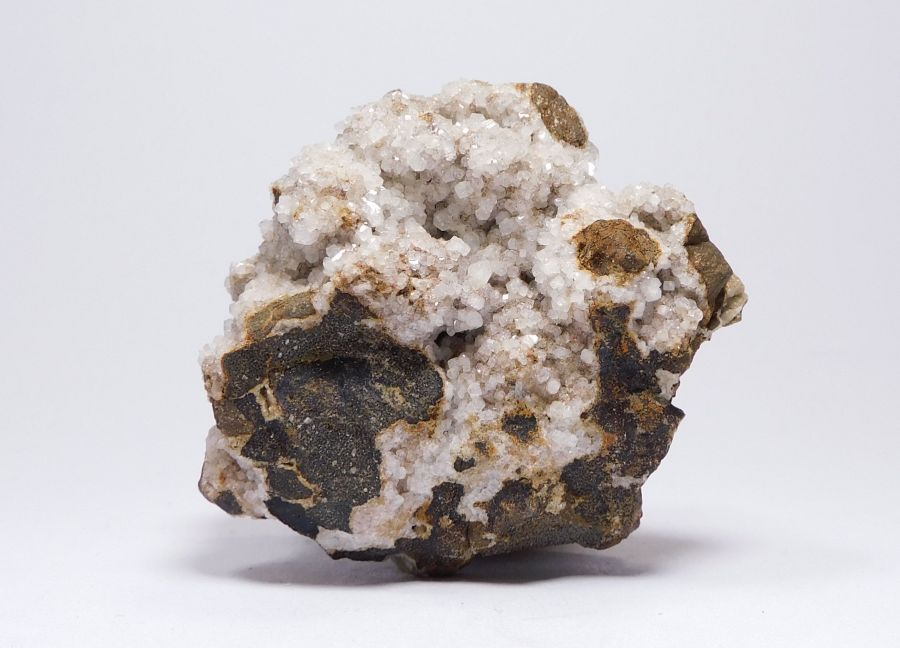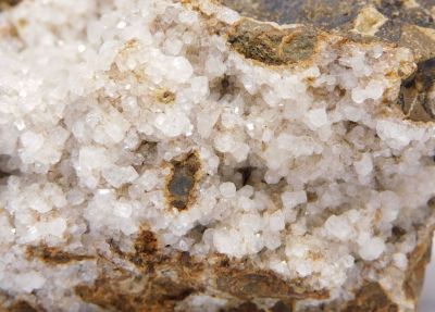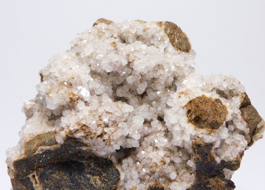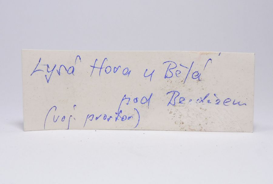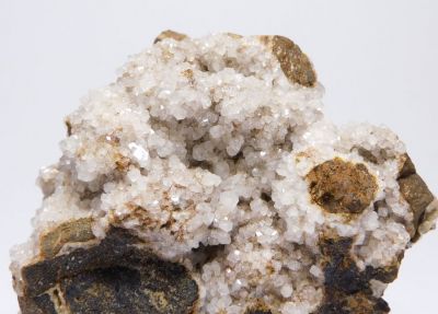 Velmi bohatá ukázka minerálu ze skupiny zeolitů - phillipsitu, který v hojné míře vytváří souvislé drúzy bezbarvých, skelně lesklých, průsvitných až průhledných, hranolovitě sloupcovitých krystalů, narůstající na bazaltovou matrici. Celková velikost 5,3x5x3,6cm. Ze starší sbírky. Za komunistů se jednalo o opuštěný kamenolom, který byl součástí vojenského prostoru, kde cvičili vojáci Sovětské armády.