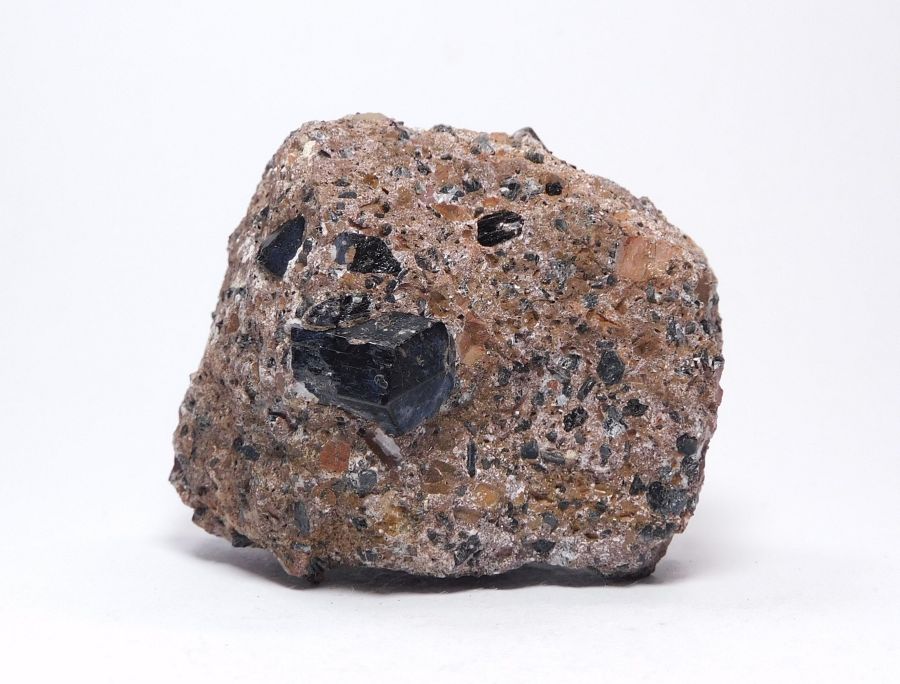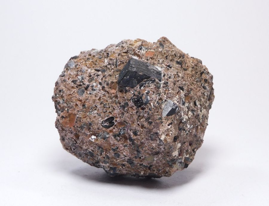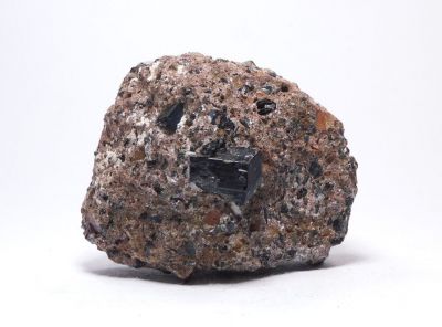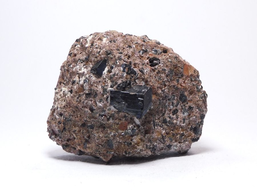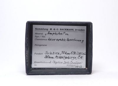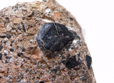 Pěkná ukázka krystalovaného horninotvorného minerálu - amfibolu, respektive kaersutitického amfibolu, jehož vyniknuvší, lesklý, sloupcovitý a zakončený krystal o délce 11mm spolu s menšími xx zarůstá do matrice alterovaného červenohnědého vulkanitu o velikosti 8,3x5x5,3cm. Nález z roku 2013. Vzorek se sbírkovou popiskou a krabičkou. Ex.Coll. G. Backmann, Drážďany, Německo.