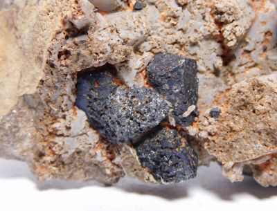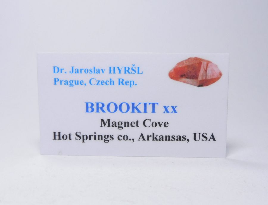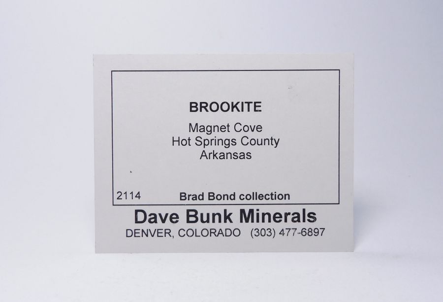 Zcela atypická ukázka oxid titaničitého - brookitu, který pochází z magmatického komplexu Magnet Cove, ležícího západně od stejnojmenného města, respektive bývalého města východně od města Hot Springs, jež má v současnosti pouze status oblasti pro sčítání lidí. Zmíněný brookit tvoří dokonale vyvinuté, na některých plochách kovově lesklé a purpurově nabíhající krystaly černé barvy až 13mm, narůstající na korodované xx křemene. Velmi kvalitní a netradiční vzorek s xx brookitu je o velikosti 7,5x4,5x5cm. Vzorek starého nálezu byl původně součástí sběratele Brada Bonda, který se narodil v den, kdy se ve 30. letech 20. století zhroutil akciový trh. Byl to chemik, který pracoval v Ohiu. Jeho rodné jméno bylo William, ale všichni mu říkali Brad. Získáno ze sbírkového depozitu RNDr. J. Hyršla, Praha.