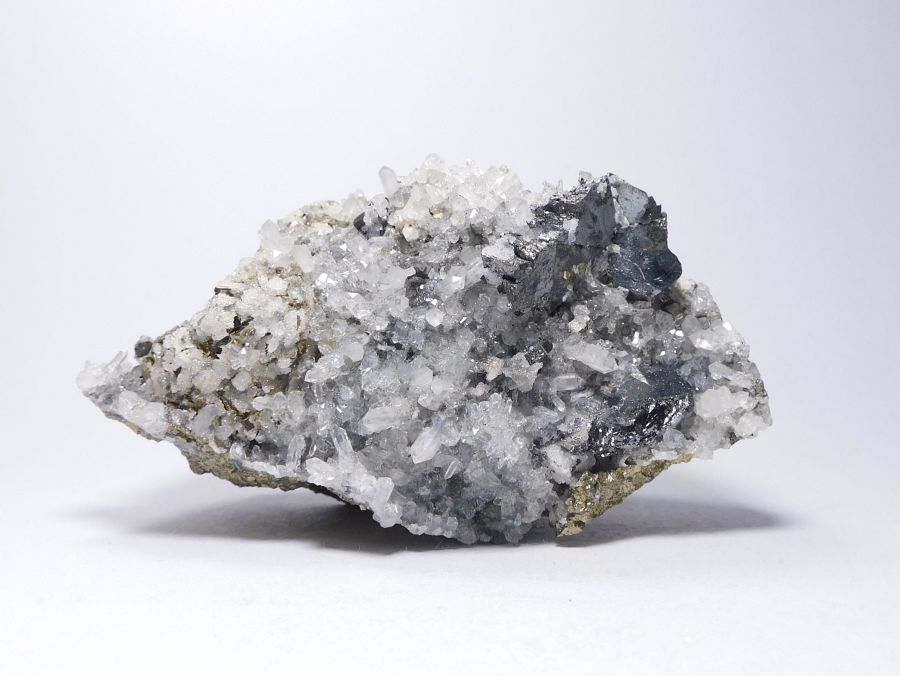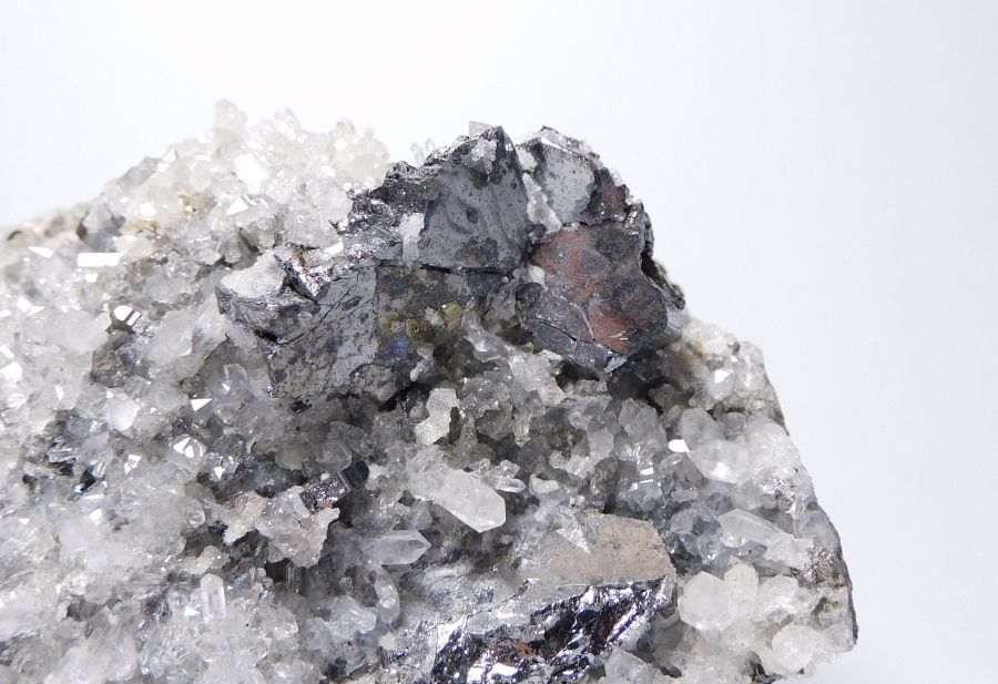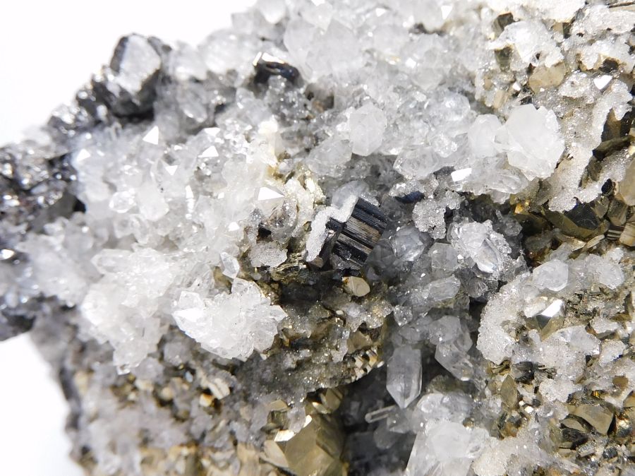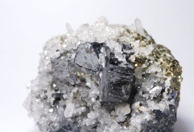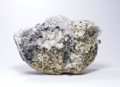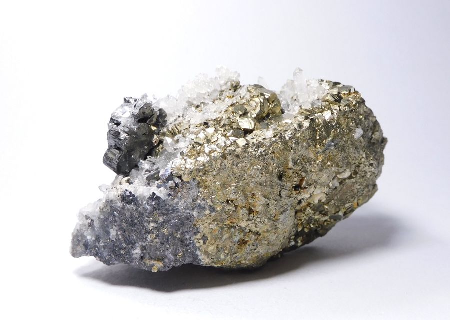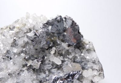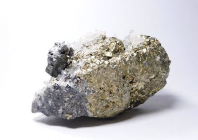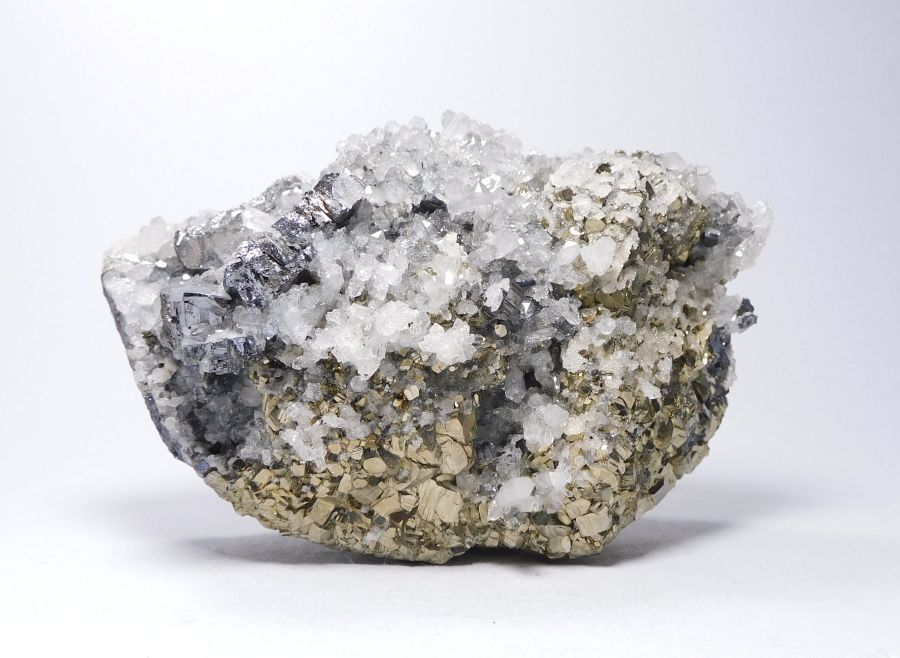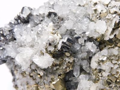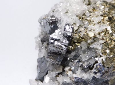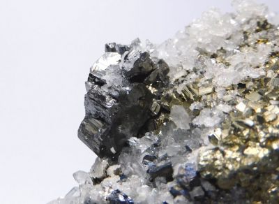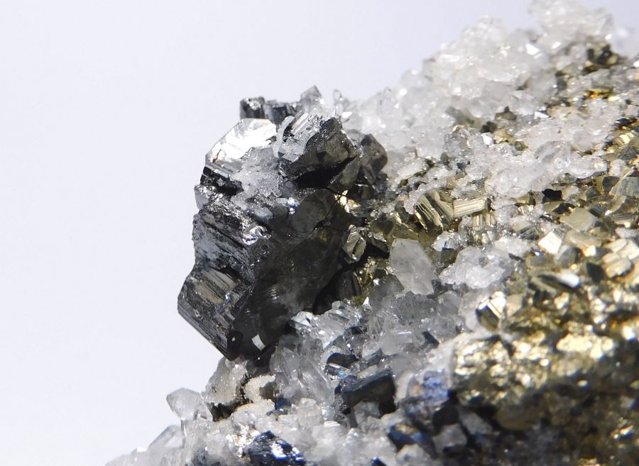 Pěkná ukázka tzv. kolečkové rudy pocházející z významného rudního komplexu Pb-Zn-Ag rud Trepča, který se nachází ve stejnojmenném údolí poblíž vesnice Stari Trg u Kosovské Mitrovice. Jedná se o rudní matrici o celkové velikosti 9,2x6,1x5,1cm, tvořenou převážně pyritem v doprovodu tmavě hnědého sfaleritu a zlatě žlutého chalkopyritu. Vyniknuvším rudním minerálem je ovšem bournonit (sulfid antimonu, olova a mědi), který v hojné míře a v podobě silně kovově lesklých, výrazně vertikálně rýhovaných, krátce sloupcovitých krystalů ocelově šedé barvy narůstá na skelně lesklé a zcela průhledné xx křemene - křišťálu. Mladší generace křišťálu v podobě velmi drobných xx posléze nasedá na starší xx křemene a xx pyritu. Srostlice xx bournonitu o délce 3,3cm nemá žádné mechanické poškození, v horní části je vyhojení.